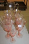 Etched Glass Pitcher, Six Pink Etched Glasses, Pink Etched Liquor Glass Etched Glass Pitcher, Six Pink Etched Glasses, Pink Etched Liquor Glass (chips). Etched Glass Pitcher, Six Pink Etched Glasses, Pink Etched Liquor Glass Etched Glass Pitcher, Six Pink Etched Glasses, Pink Etched Liquor Glass (chips).