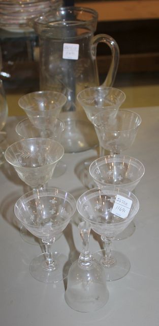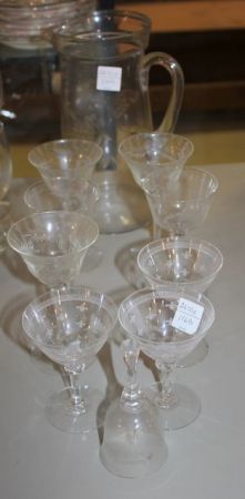 267 Etched Glass Pitcher, Nine Small Etched Wine Glasses, 25th Anniversery Bell Wine Glasses-4"-5"h.