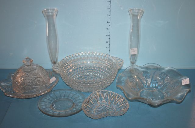 Various Clear Glass Pieces Including Butter Dish, Two Bad Vases, Iris Bowl, Clear Bowl Clear Bowl" 10". Various Clear Glass Pieces Including Butter Dish, Two Bad Vases, Iris Bowl, Clear Bowl Clear Bowl" 10".