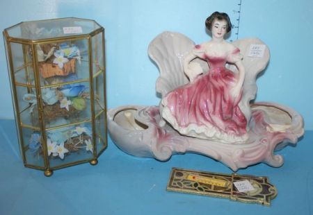 285 1950's Lane Company Planter (Chipped) Stain Glass Thermometer Clock, Small Vitrine Clock: 6"h., Vitrine: 8"h.