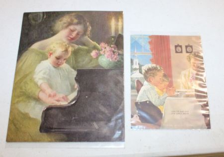 301 Two Vintage Art Prints 1950's "Give Us This Day" family prayer calendar art print 4"w., 6"h., and 1940's "The First Lesson" mother, child, piano, calendar art print 6"w., 8"h.