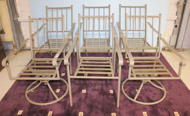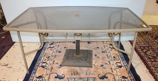 365 Rectangular Glass Top Patio Table And Set of Six Metal Patio Chairs Rectangular glass top patio table with umbrella stand; 63" w., 39" d., 28" h. Set of six metal patio furniture chairs; 22" w., 25" d., 35" h.