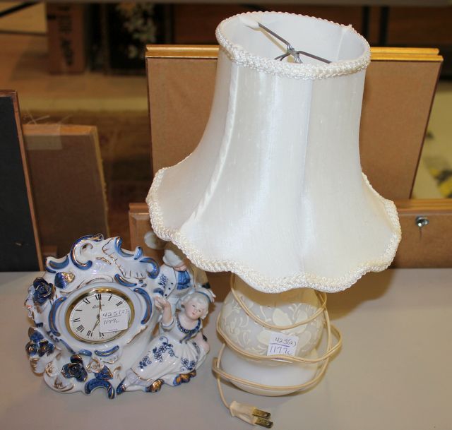 425 Vintage Linden Blue and White Porcelain Alarm Clock and Vintage Lamp Clock: 7"w., 6"h. Lamp: 14"h.