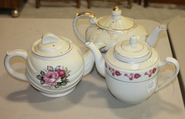 597 Teapot Collection Two Vintage teapots and covered sugar.