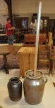 Antique Butter Churn and Small Crock Jar Antique Butter Churn 12"h. and Small Crock Jar 9"h. Antique Butter Churn and Small Crock Jar Antique Butter Churn 12"h. and Small Crock Jar 9"h.