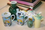 737 Alice in Wonderland Pitcher, Two Mugs, Mini Cloisonn Vase, Two Vases 2"h.