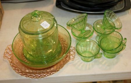 Group of Depression Glass Which includes cookie jar (chips) sherberts, cups, bowl, two sandwich plates, 5 small green plates (various chips). Group of Depression Glass Which includes cookie jar (chips) sherberts, cups, bowl, two sandwich plates, 5 small green plates (various chips).