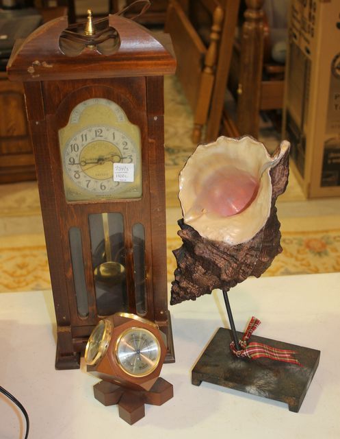 Electric Clock, Mounted Sea Shell, and Barometer Electric Clock 7"w., 21"h., Mounted Sea Shell, and Barometer Electric Clock, Mounted Sea Shell, and Barometer Electric Clock 7"w., 21"h., Mounted Sea Shell, and Barometer