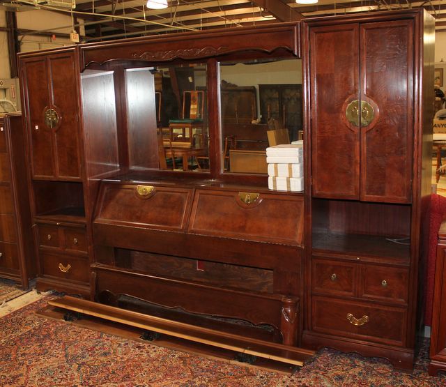 Contemporary King Size Bed Two mirrors in center and cabinets on each side. Cabinets have interior shelves, two bottom drawers. Contemporary King Size Bed Two mirrors in center and cabinets on each side. Cabinets have interior shelves, two bottom drawers.