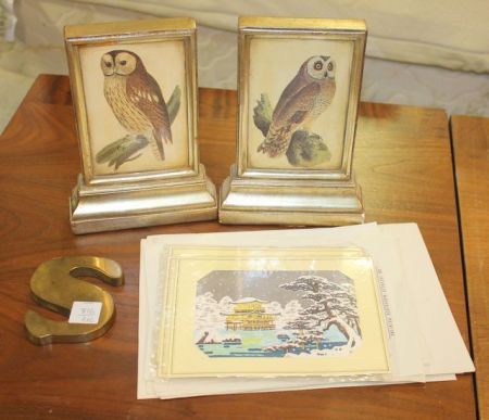 798 Pair of Owl Bookends and Prints Pair of Owl Bookends and Prints