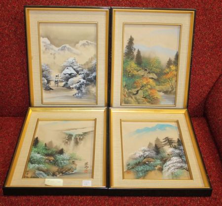 814 Four Handpainted and Framed Oriental Pictures 11"w., 16"h.