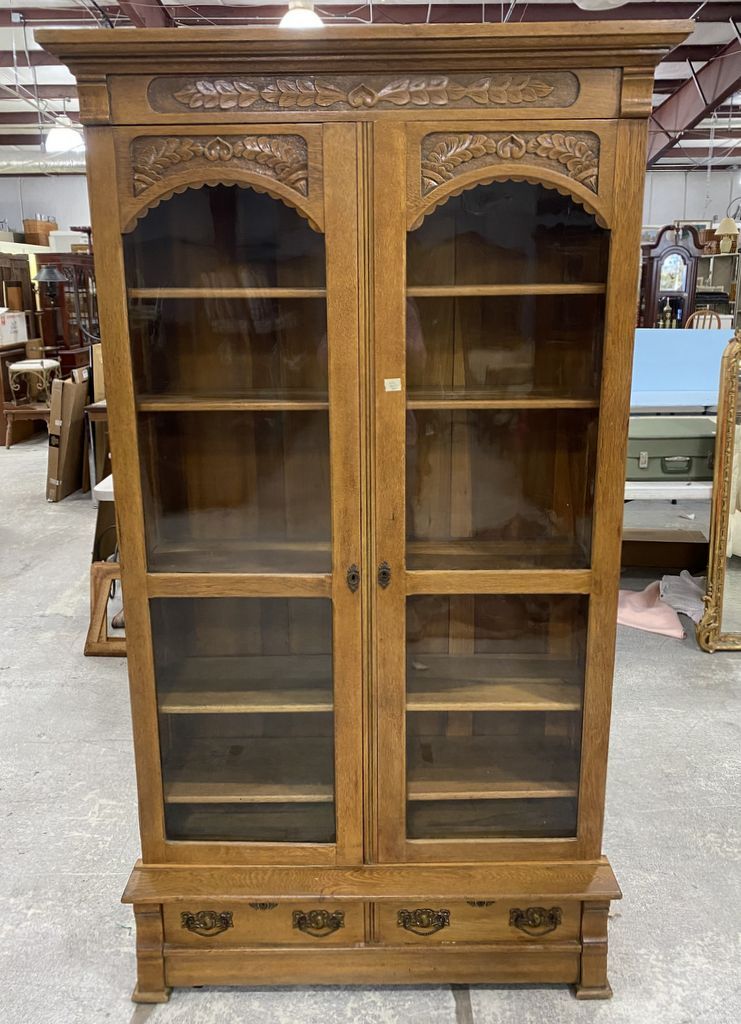 Early 20th Century Oak Victorian Style Bookcase, two door, five wood shelves, two drawers, carved designs, 80"h., 42"w. 18"d. Early 20th Century Oak Victorian Style Bookcase, two door, five wood shelves, two drawers, carved designs, 80"h., 42"w. 18"d.