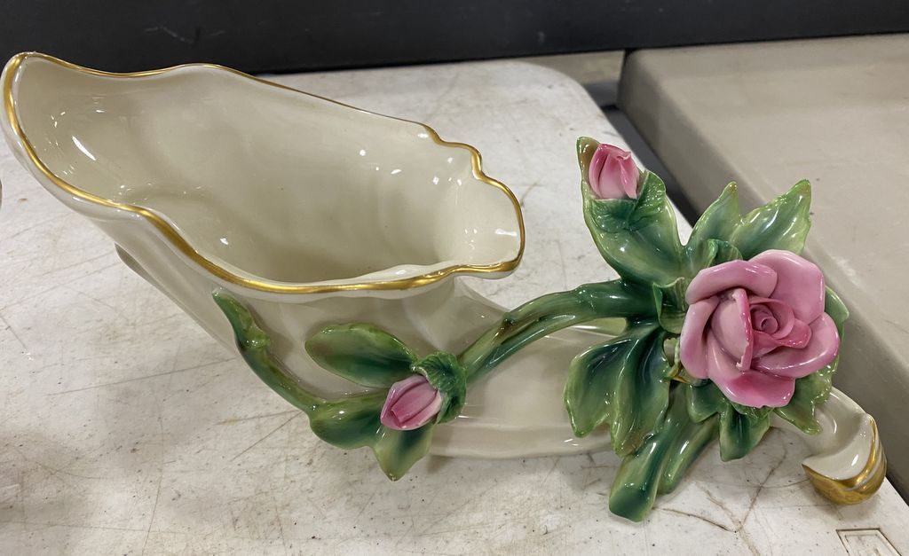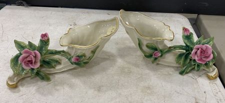 Pair of Dresden Cornucopia Porcelain Vases, hand painted, 10"w, Location Front Left Shelves Pair of Dresden Cornucopia Porcelain Vases, hand painted, 10"w, Location Front Left Shelves