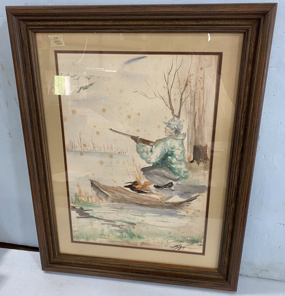 De Myers 1984 Signed Hunting Watercolor, matted, framed, 27"h., 21"w. Location Right Office 2 De Myers 1984 Signed Hunting Watercolor, matted, framed, 27"h., 21"w. Location Right Office 2