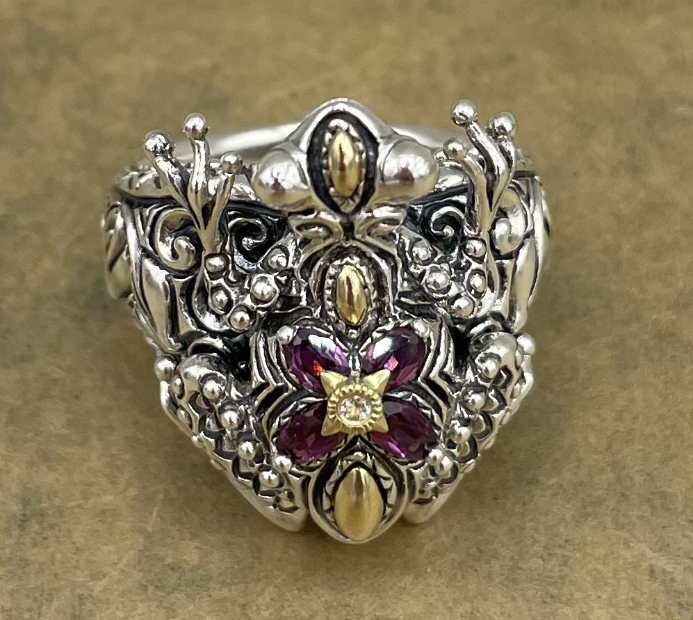 Designer Sterling Silver .925 18K Stamped "Bixby" China Frog Ring, with rubellite tourmaline gemstones, 18.1 grams, size 8, Location Case by Office Designer Sterling Silver .925 18K Stamped "Bixby" China Frog Ring, with rubellite tourmaline gemstones, 18.1 grams, size 8, Location Case by Office