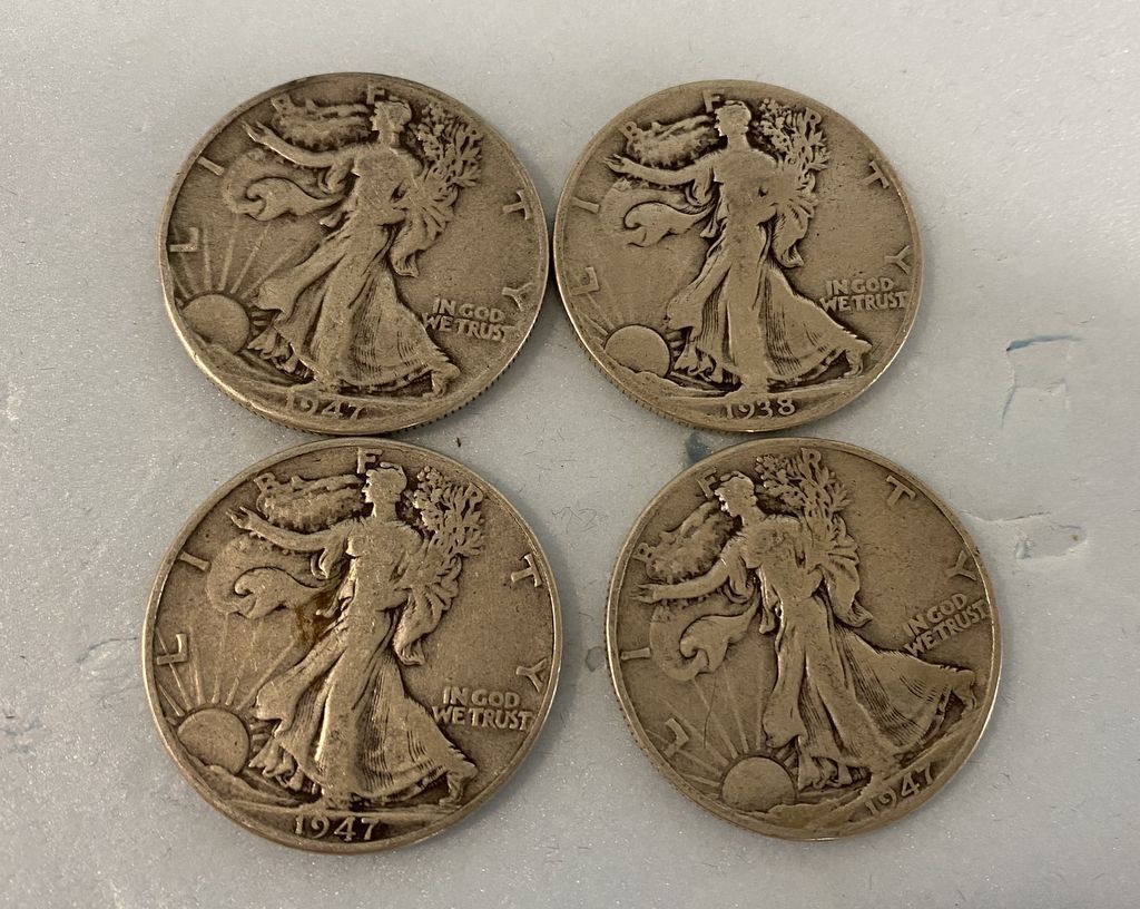 Four Walking Liberty Half Dollar, 3-1947, 1938, average/good condition, Location Case by Office Four Walking Liberty Half Dollar, 3-1947, 1938, average/good condition, Location Case by Office
