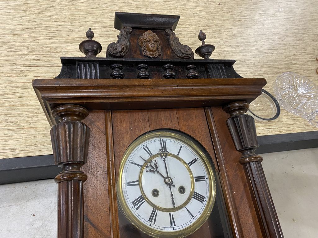 Vintage Mahogany Wall Clock, Victorian style, has pendulum, good condition, 39"h, Location Row 2 Vintage Mahogany Wall Clock, Victorian style, has pendulum, good condition, 39"h, Location Row 2