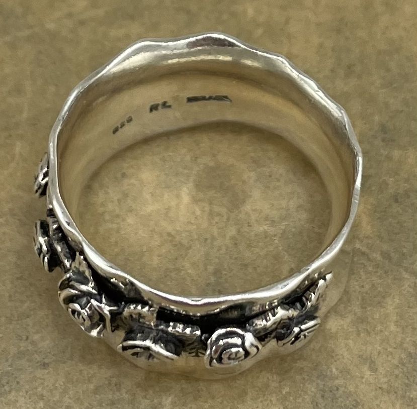Sterling .925 Stamped "RL" Israel Scalloped Cuff Ring with dimensional rosette center design, 8.6 grams, size 8, comfort fit/tapered interior band, location Case by Office Sterling .925 Stamped "RL" Israel Scalloped Cuff Ring with dimensional rosette center design, 8.6 grams, size 8, comfort fit/tapered interior band, location Case by Office