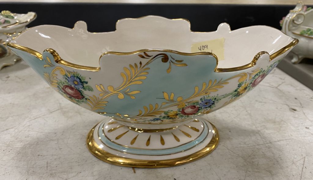 Hand Painted Italian Porcelain Compote, floral, 4 1/2"h., 10"w, Location Front Left Shelves Hand Painted Italian Porcelain Compote, floral, 4 1/2"h., 10"w, Location Front Left Shelves