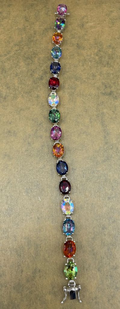 Sterling .925 Stamped "SIS" India multi colored iridescent faceted Tennis Bracelet, 18.7 grams, 8.5", Location Case by Office Sterling .925 Stamped "SIS" India multi colored iridescent faceted Tennis Bracelet, 18.7 grams, 8.5", Location Case by Office