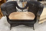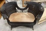 Victorian Style Painted Wicker Gossip Settee, missing cushion, some age wear, 30"h., 48"w. Location Row 1 Victorian Style Painted Wicker Gossip Settee, missing cushion, some age wear, 30"h., 48"w. Location Row 1