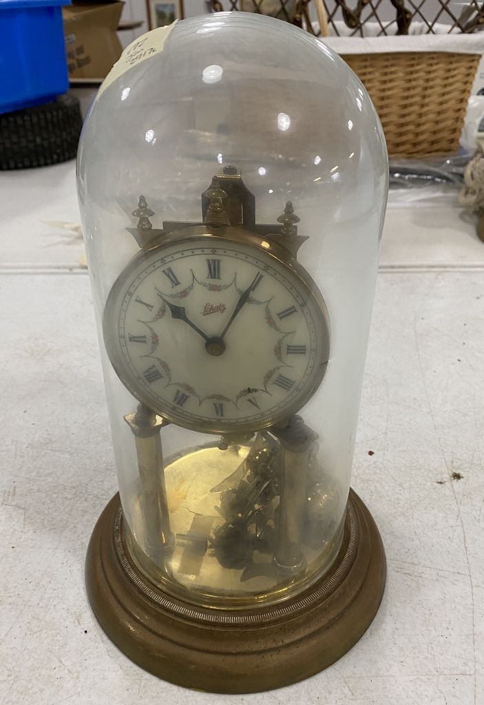 Schatz Anniversary Clock, glass dome, 12"h, Location Right Metal Shelves Schatz Anniversary Clock, glass dome, 12"h, Location Right Metal Shelves