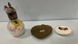 Silverplate Vessel, Brass Strawberry Tray 8" Length 7.5" Width, and Saucer Royal Stuart, Location Back Metal Shelves Silverplate Vessel, Brass Strawberry Tray 8" Length 7.5" Width, and Saucer Royal Stuart, Location Back Metal Shelves