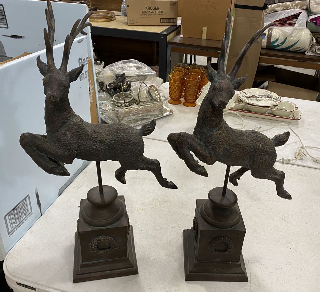 Pair of Resin Red Stag Figurals on Pedestals, 24"h, Location Back Metal Shelves Pair of Resin Red Stag Figurals on Pedestals, 24"h, Location Back Metal Shelves