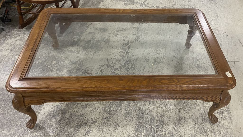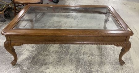 Modern Oak Queen Anne Coffee Table, glass top, 16"h., 48"w. Location Row 3 Modern Oak Queen Anne Coffee Table, glass top, 16"h., 48"w. Location Row 3