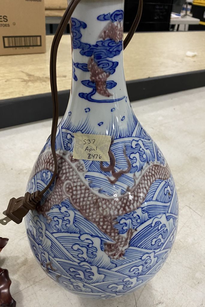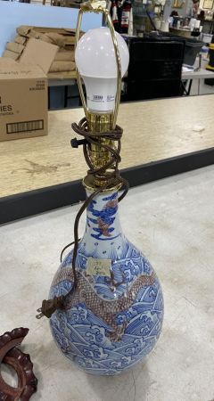 Chinese Blue and White Porcelain Vase Lamp, base is damaged, 24"h., Location Back Metal Shelves Chinese Blue and White Porcelain Vase Lamp, base is damaged, 24"h., Location Back Metal Shelves