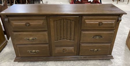 Late 20th Century Oak Finish Dresser, has scratches, includes mirrors, 31"h., 60"w. Location Row 5 Late 20th Century Oak Finish Dresser, has scratches, includes mirrors, 31"h., 60"w. Location Row 5