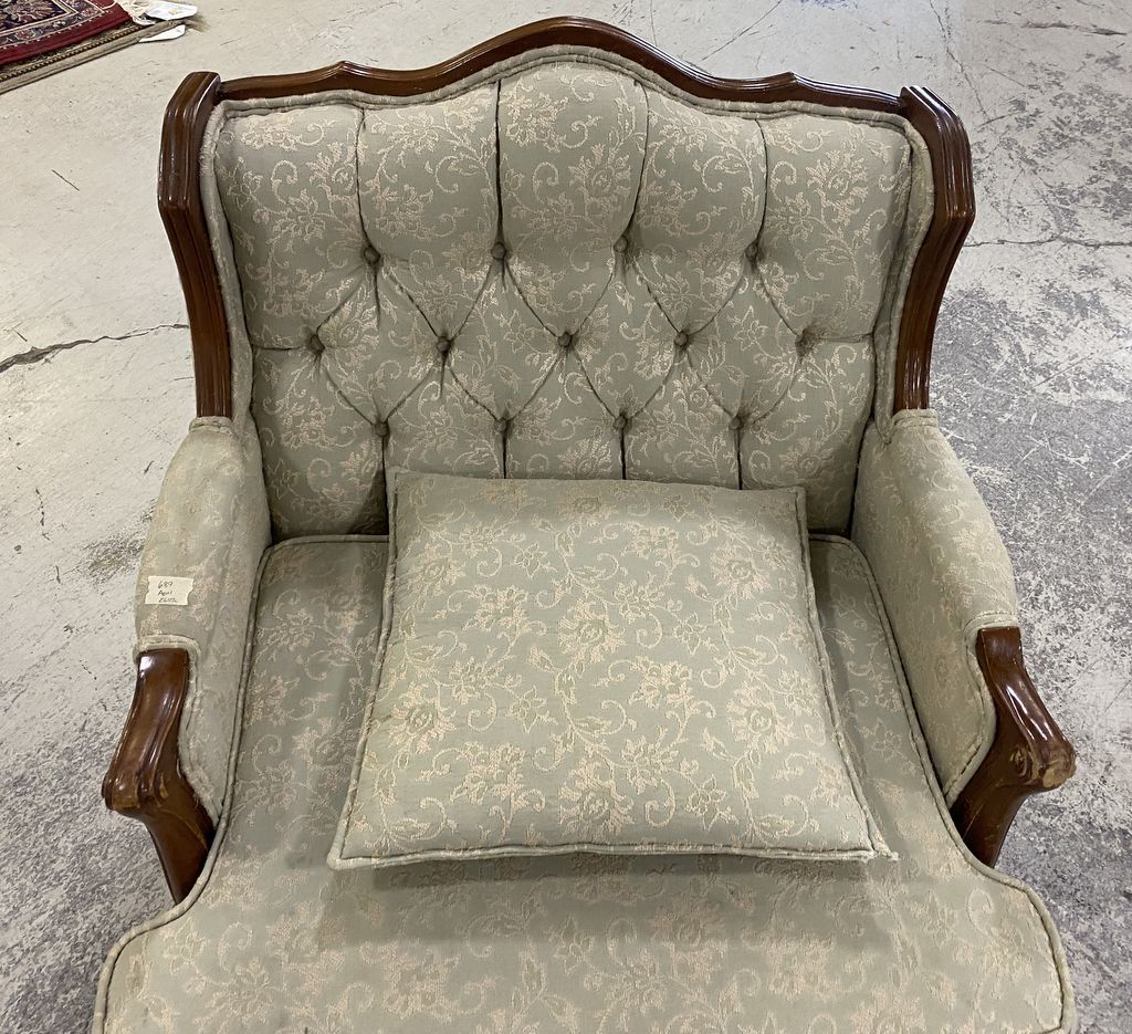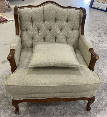 French Provincial Arm Chair, finish has worn spots, fabric clean. Location Row 1 French Provincial Arm Chair, finish has worn spots, fabric clean. Location Row 1