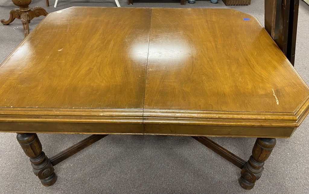 Vintage Jacobean Style Dining Table, has wear on top, 3 leaf and pads, 29"h,. 59"w. Location Row 4 Vintage Jacobean Style Dining Table, has wear on top, 3 leaf and pads, 29"h,. 59"w. Location Row 4
