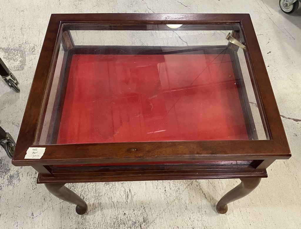Modern Cherry Queen Anne Curio Table, top bracelet is bent but still working, felt lining, 24"h., 23"w., Location Left Wall Modern Cherry Queen Anne Curio Table, top bracelet is bent but still working, felt lining, 24"h., 23"w., Location Left Wall