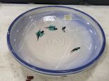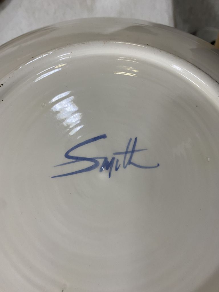 Signed Smith Porcelain Serving Bowl, small rim nicks, 12"dia, Location Right Metal Shelves Signed Smith Porcelain Serving Bowl, small rim nicks, 12"dia, Location Right Metal Shelves