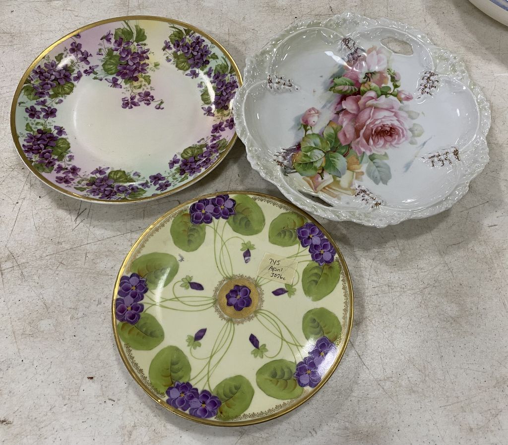 Three Vintage Hand Painted Porcelain Plates, serving plates, Location Right Metal Shelves Three Vintage Hand Painted Porcelain Plates, serving plates, Location Right Metal Shelves