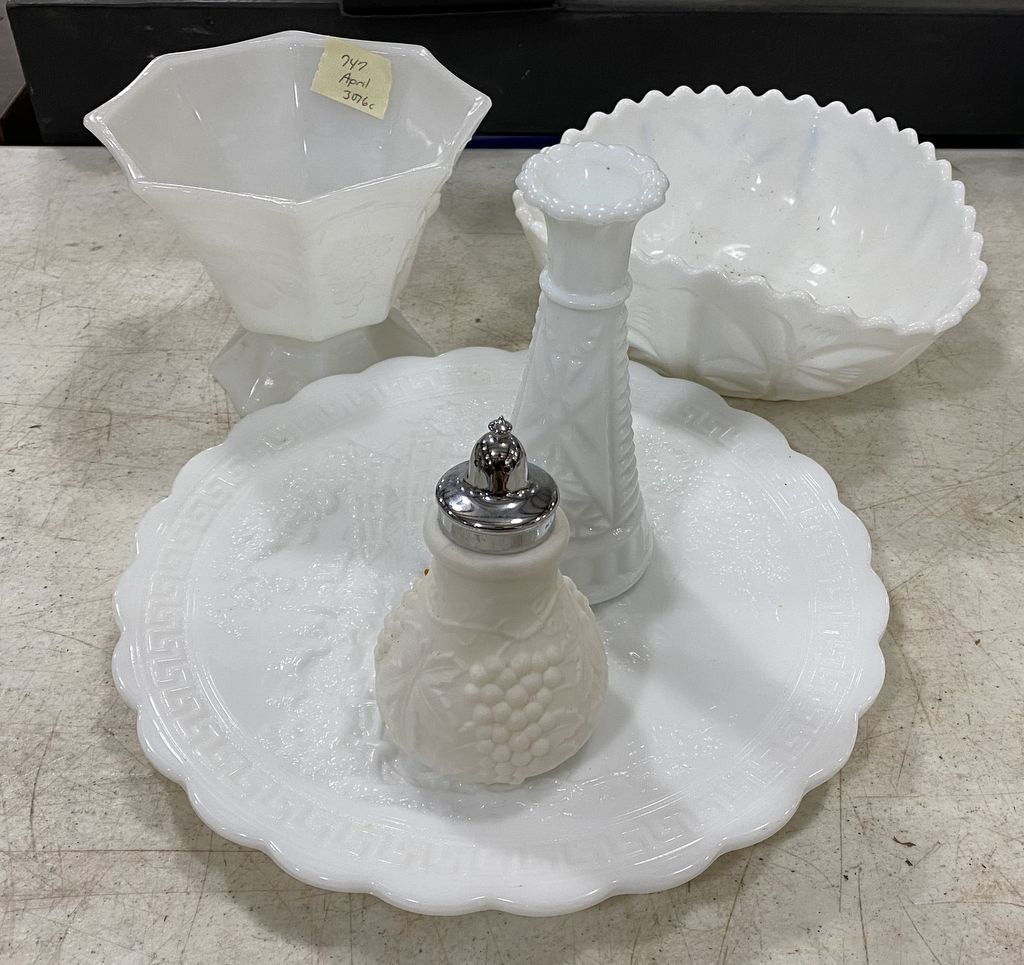 Group of Milk Glass Pieces, plate, vase, compote, and bowl, Location Right Metal Shelves Group of Milk Glass Pieces, plate, vase, compote, and bowl, Location Right Metal Shelves