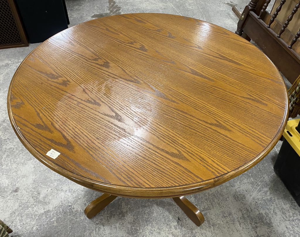 Modern Oak Round Pedestal Dining Table, has ring spot on top, 29"h,. 42"dia. Location Row 3 Modern Oak Round Pedestal Dining Table, has ring spot on top, 29"h,. 42"dia. Location Row 3