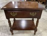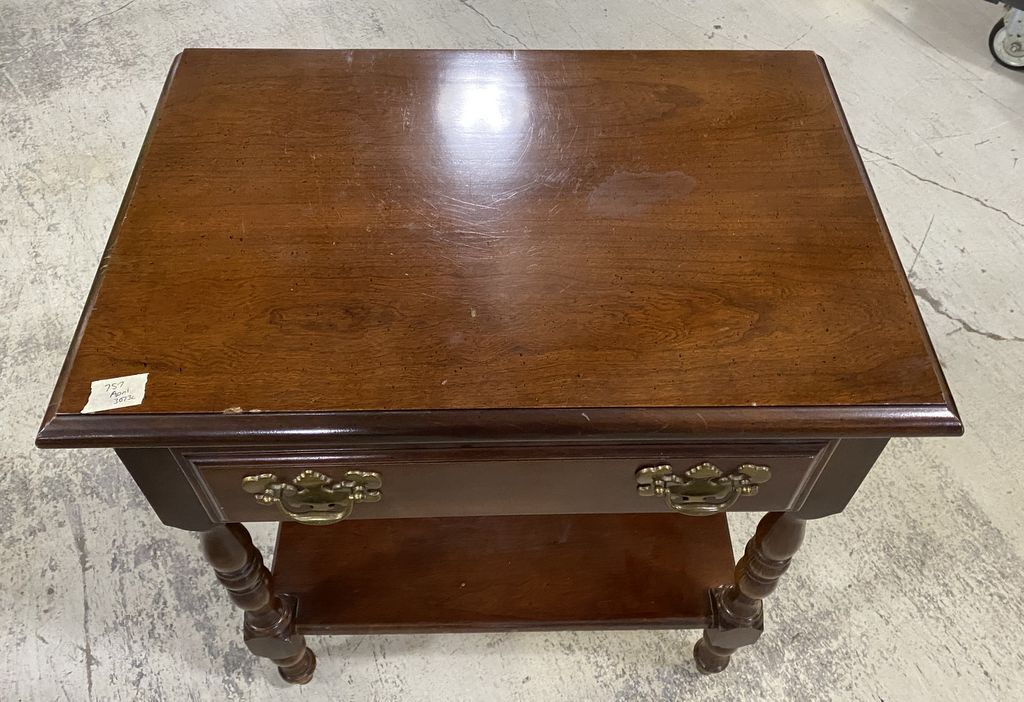 Late 20th Century Cherry Side Table, traditional style, single drawer, has finish wear, 25"h., 24"w. Location Row 3 Late 20th Century Cherry Side Table, traditional style, single drawer, has finish wear, 25"h., 24"w. Location Row 3