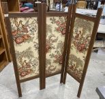 Three Panel wood screen, fabric floral bird scenes, 56"h., 16"w. Location Right Office Three Panel wood screen, fabric floral bird scenes, 56"h., 16"w. Location Right Office