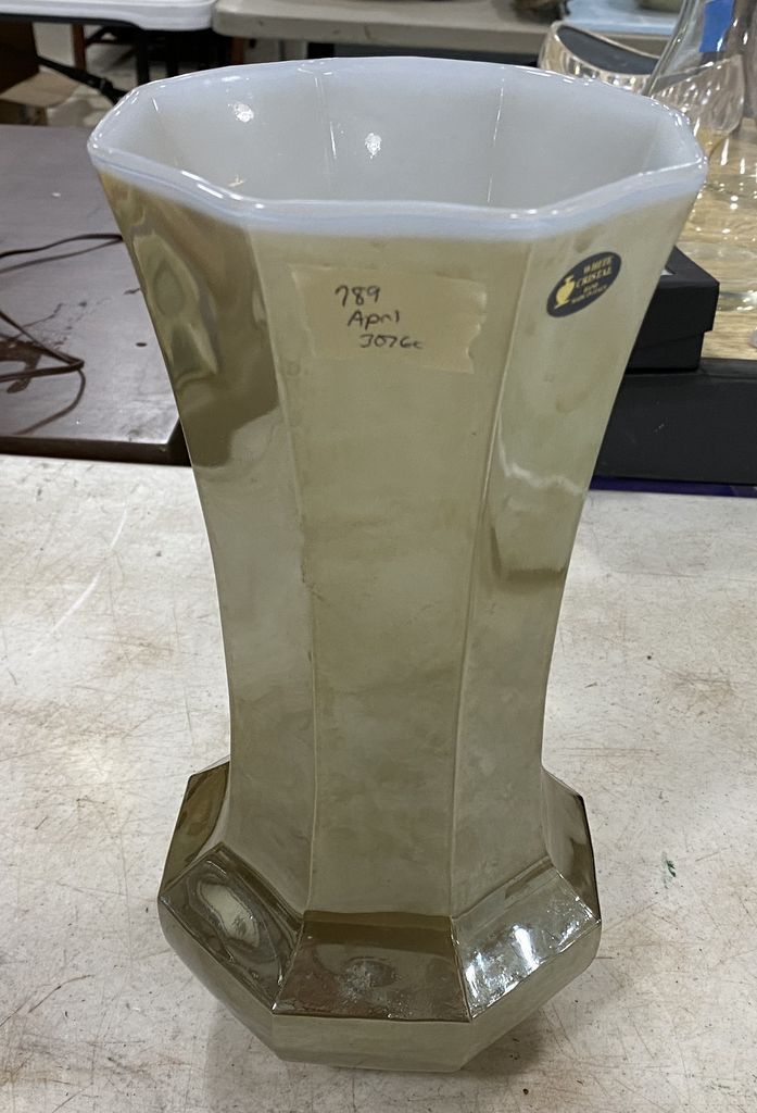 White Crystal Hand made Italy Glass Vase, 12"h, Location Right metal Shelves White Crystal Hand made Italy Glass Vase, 12"h, Location Right metal Shelves