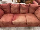 Red Three Cushion Suede Like Sofa, has wear, 7', has feet, Location Row 1 Red Three Cushion Suede Like Sofa, has wear, 7', has feet, Location Row 1