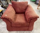 Large Red Suede Like Arm Chair, has wear. Location Row 1 Large Red Suede Like Arm Chair, has wear. Location Row 1