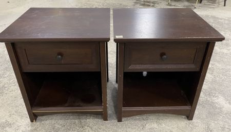 Pair of Cherry Pressed Wood Nightstands, single drawer, has moisture damage, 24"h., 22"w. Location Row 5 Pair of Cherry Pressed Wood Nightstands, single drawer, has moisture damage, 24"h., 22"w. Location Row 5
