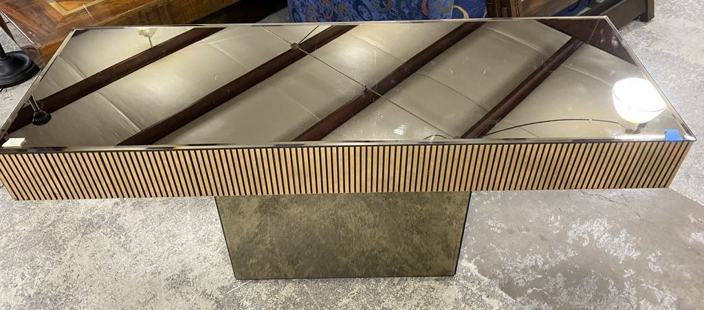 Decorative Mirrored Glass Sofa Table with pedestal base, two piece, 26"h., 60"w. Location Row 2 Decorative Mirrored Glass Sofa Table with pedestal base, two piece, 26"h., 60"w. Location Row 2