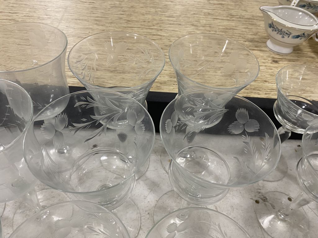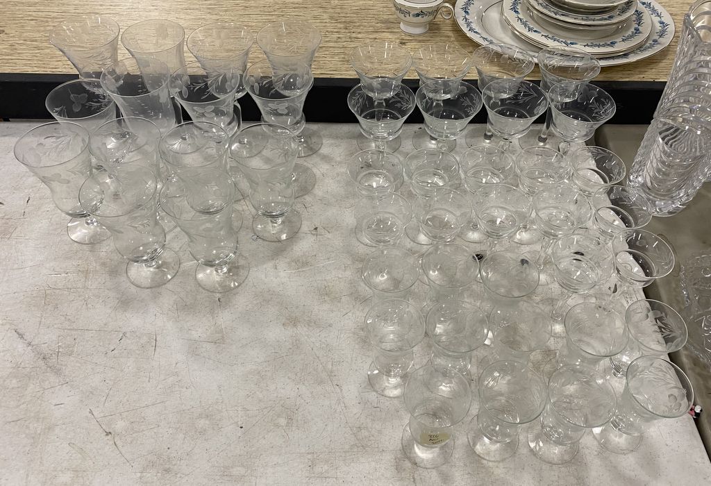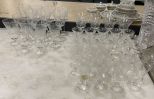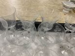 Large Group of Etched Stemware Glasses, Location Back Metal Shelves Large Group of Etched Stemware Glasses, Location Back Metal Shelves