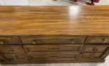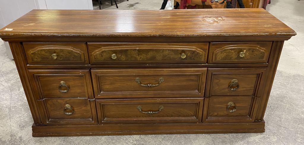 Bassett Furniture Co. Oak Finish Triple Dresser, finish is worn, 30"h., 64"w. includes mirror. Location Row 5 Bassett Furniture Co. Oak Finish Triple Dresser, finish is worn, 30"h., 64"w. includes mirror. Location Row 5