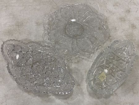 Pressed Glass Footed Platter, and Banana Dishes, Location Back Metal Shelves Pressed Glass Footed Platter, and Banana Dishes, Location Back Metal Shelves