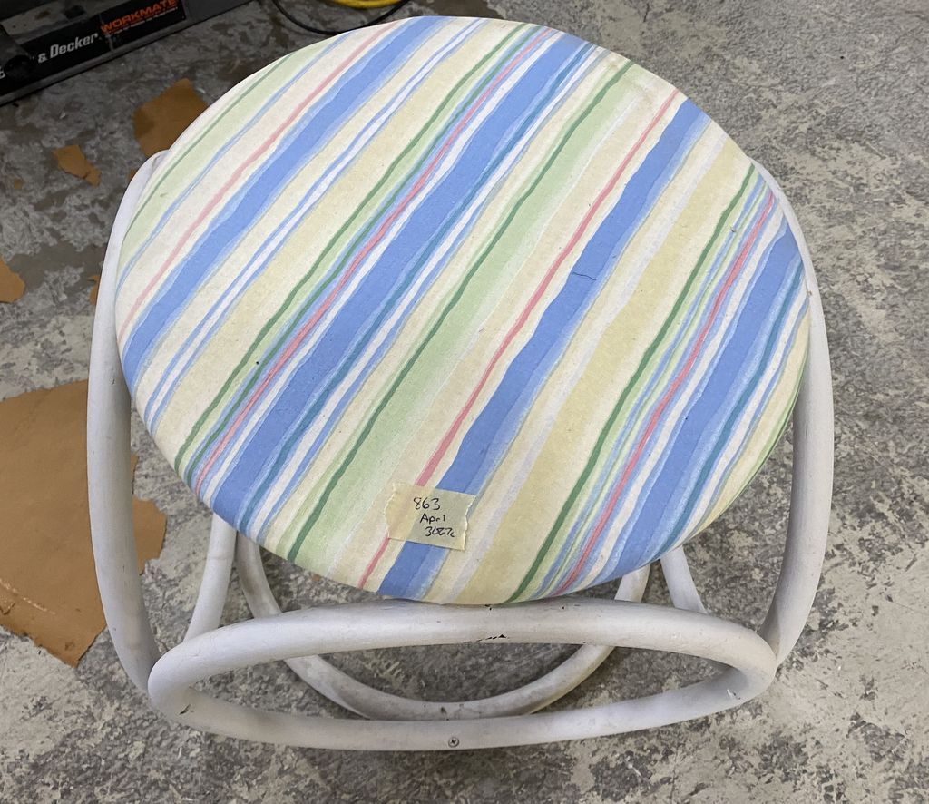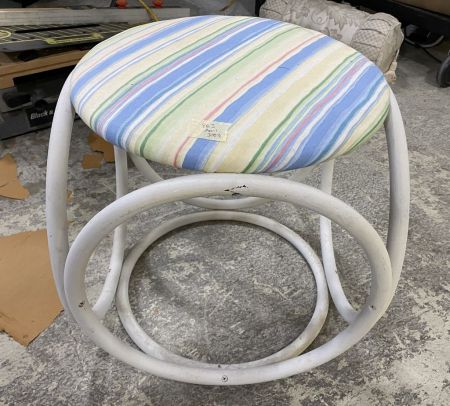 White Painted Bentwood Vanity Stool, striped cushion seat, Location Row 3 White Painted Bentwood Vanity Stool, striped cushion seat, Location Row 3
