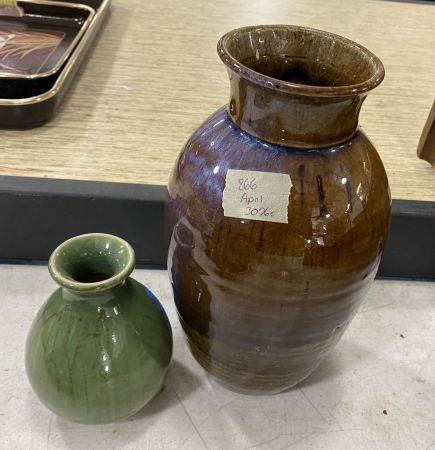 Hand Crafted Stoneware Pottery Vases, glazed, tallest is 10"h, Location Right Metal Shelves Hand Crafted Stoneware Pottery Vases, glazed, tallest is 10"h, Location Right Metal Shelves